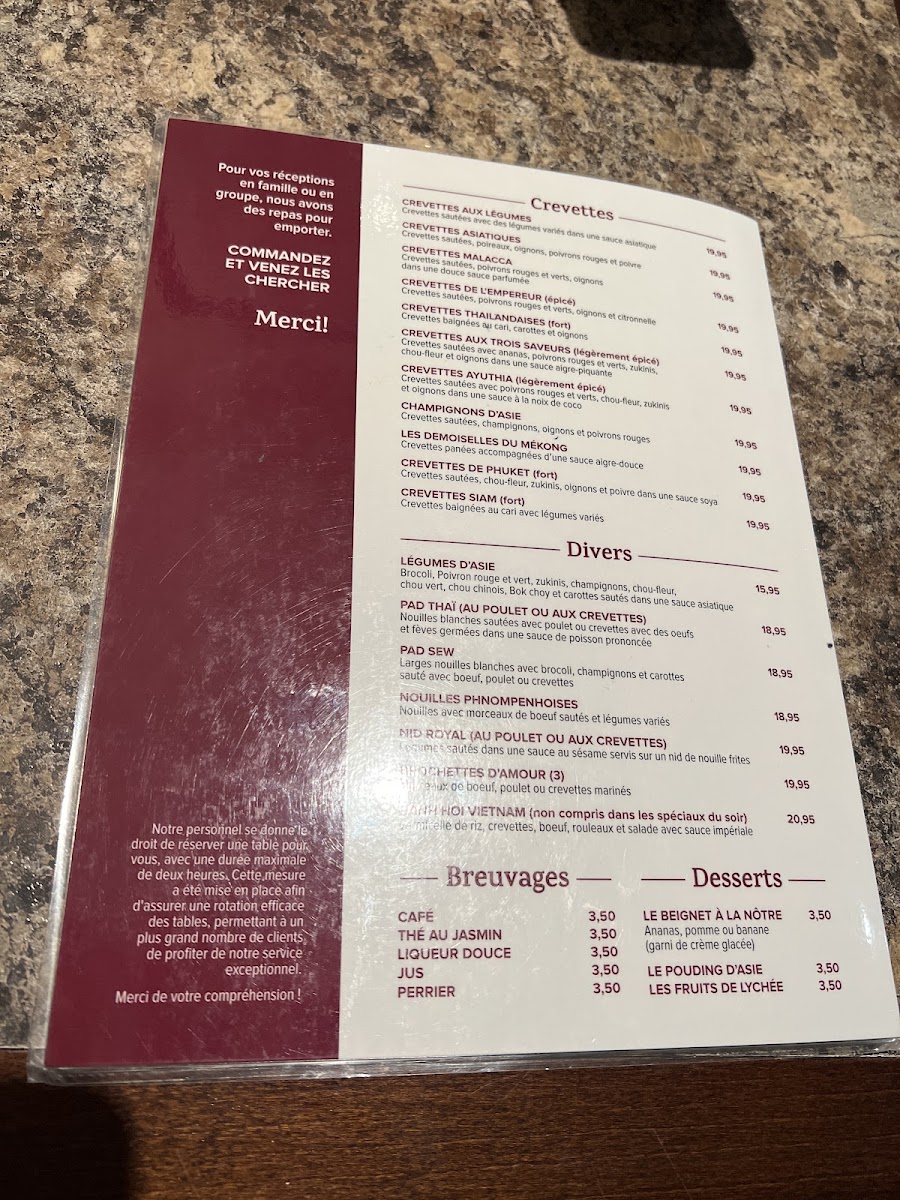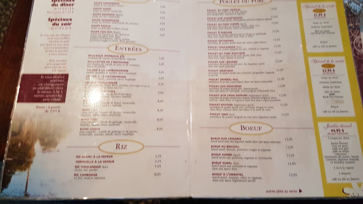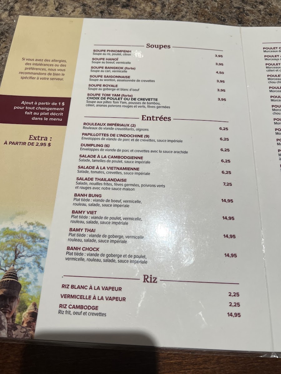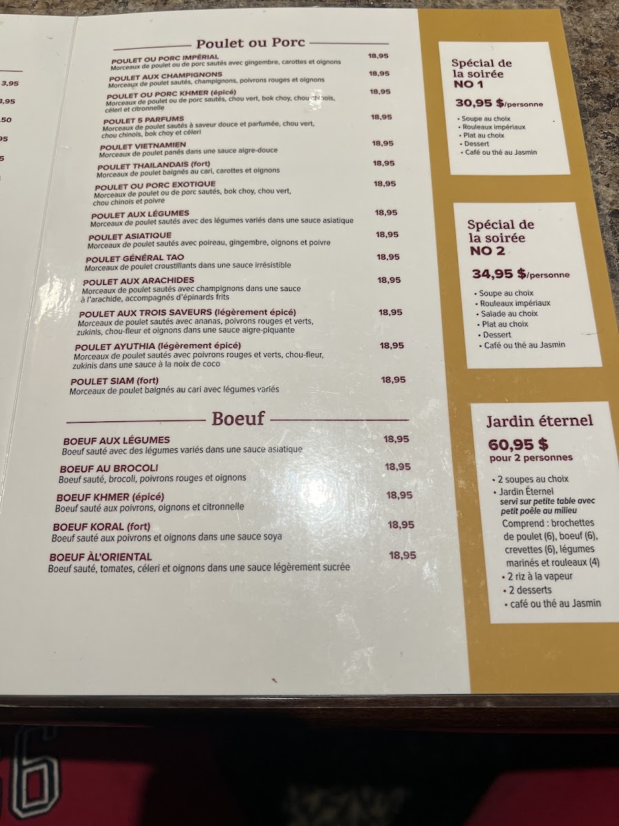 The menu at Restaurant Cambodiana offers a vibrant journey through Cambodian flavors, balancing rich spices with delicate textures. Among the highlights, Poulet Ayuthia stands out with its tender chicken infused with aromatic herbs, delivering a harmonious blend of sweet and savory notes that linger pleasantly on the palate. Equally impressive, Nid Royale Aux Crevettes presents a visually striking dish, combining succulent shrimp with a light, crispy nest that adds both texture and elegance to each bite. Beyond these signature offerings, the menu features a variety of traditional dishes that emphasize fresh ingredients and authentic preparation, making each plate feel thoughtfully crafted. Whether indulging in the nuanced sauces or savoring the perfectly balanced seasoning, the menu consistently showcases the restaurant’s dedication to quality and authenticity, leaving diners with a memorable taste of Cambodian cuisine.